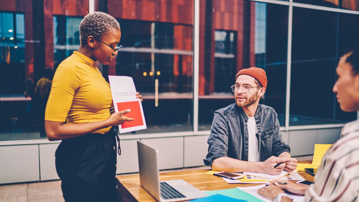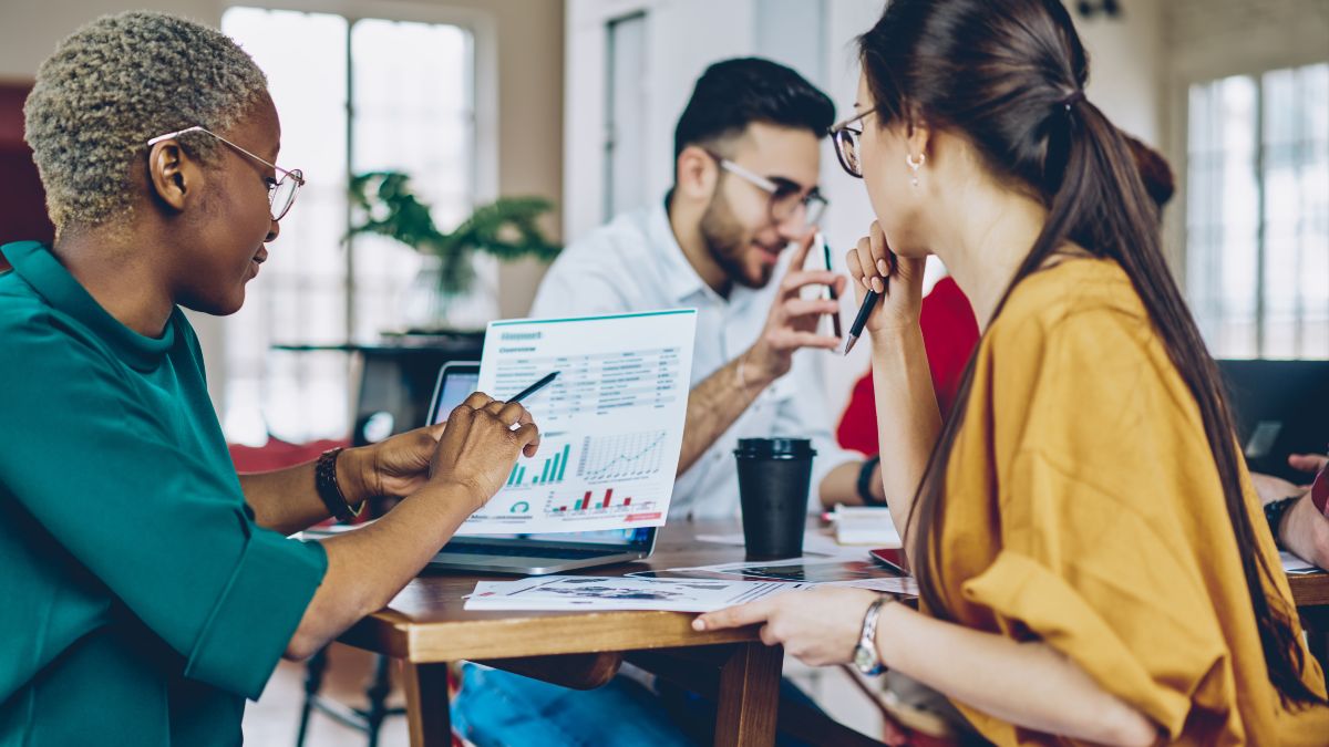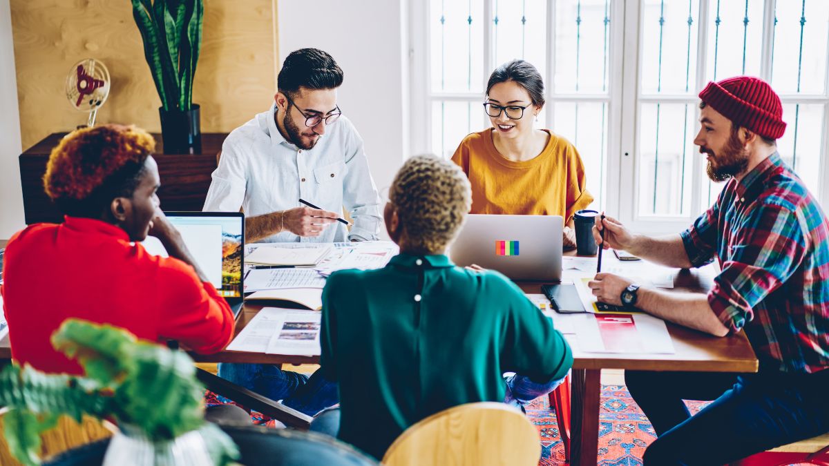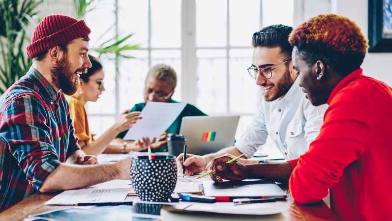 Team von jungen Gründern sitzt an einem Tisch und bespricht sich.